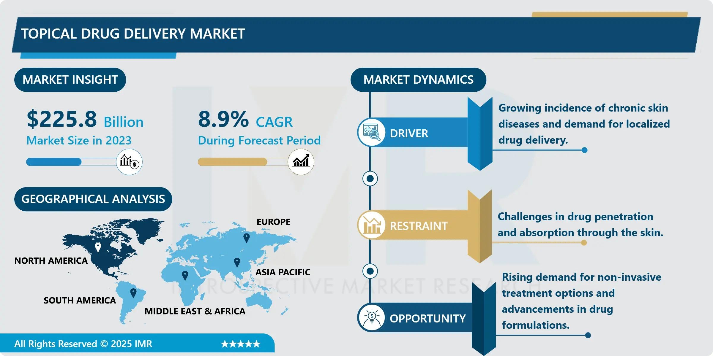 The increasing prevalence of skin disorders, rising geriatric population, growing demand for non-invasive therapies, and expanding pharmaceutical R&D activities are driving market growth globally. Additionally, consumer preference for self-administration and over-the-counter topical products continues to boost market adoption across both developed and emerging economies.