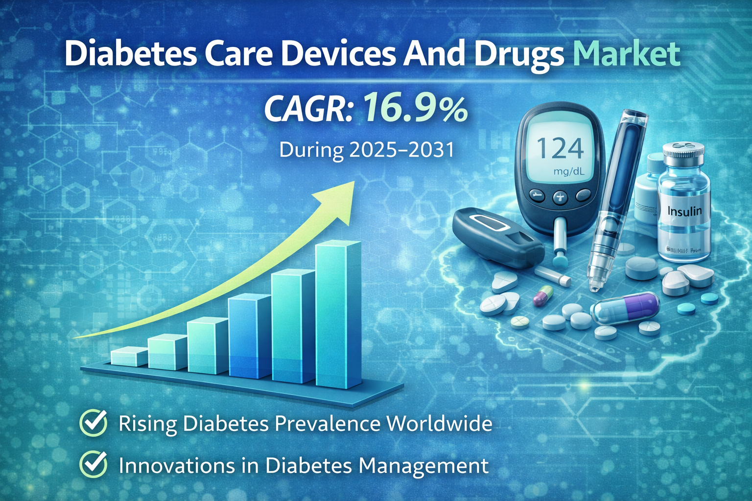 The global Diabetes Care Devices and Drugs Market is witnessing rapid expansion due to the increasing prevalence of diabetes, technological innovations in treatment solutions, and rising awareness regarding effective disease management. Diabetes remains one of the most common chronic conditions worldwide, creating a significant demand for monitoring devices, insulin delivery systems, and advanced pharmaceutical therapies. According to industry analysis, the market is expected to register a compound annual growth rate (CAGR) of 16.9% during the forecast period from 2025 to 2031, reflecting strong demand across healthcare systems globally.